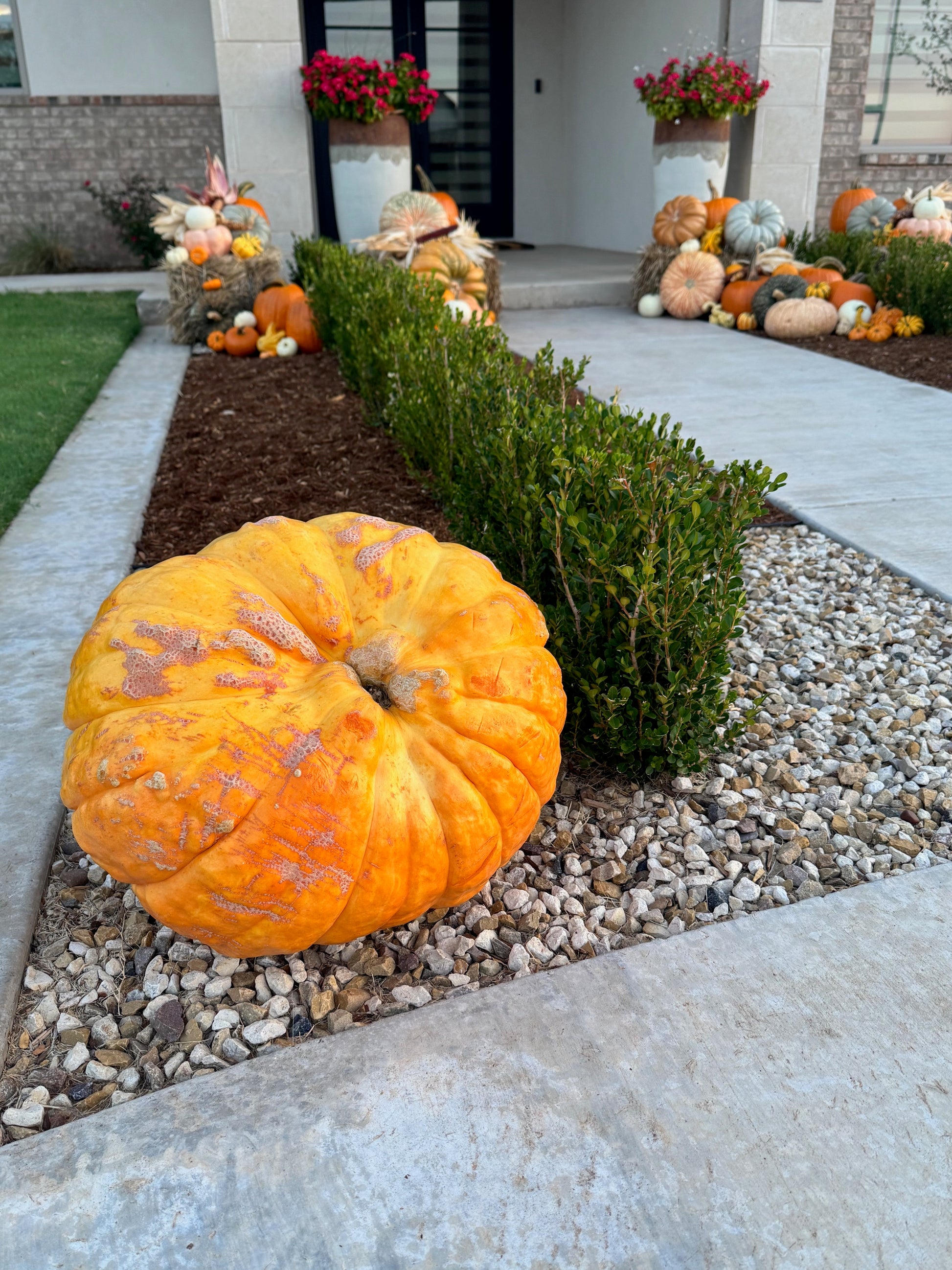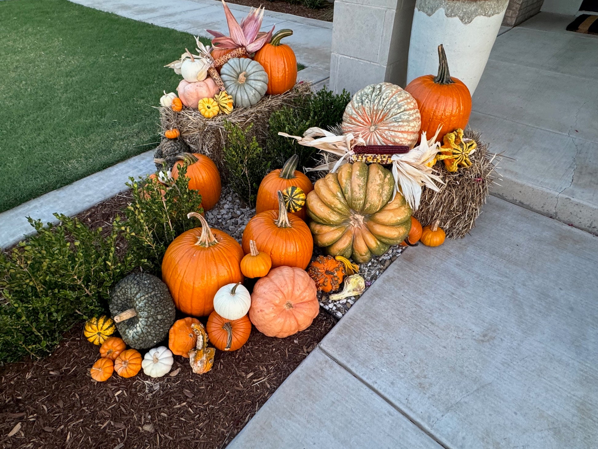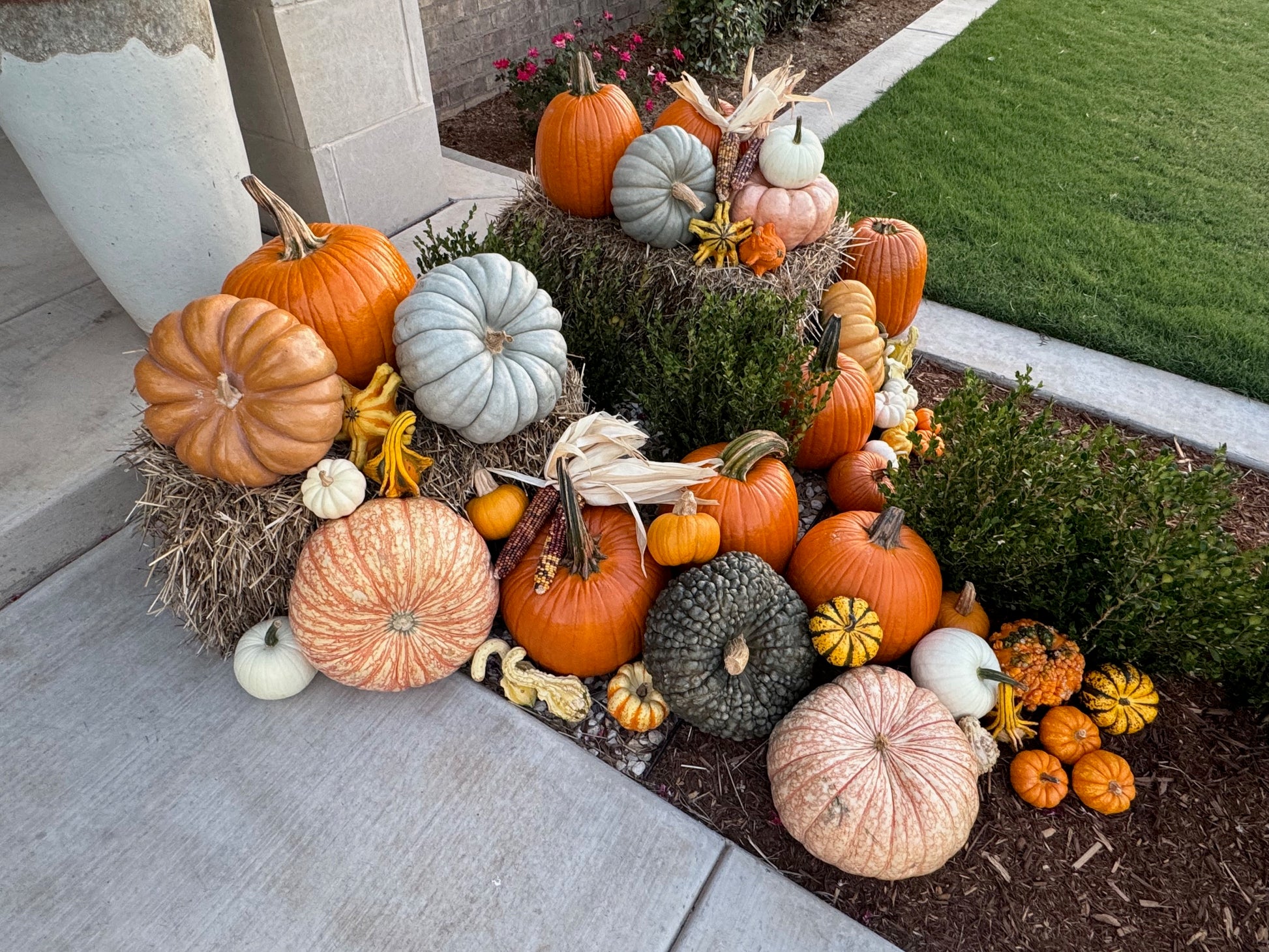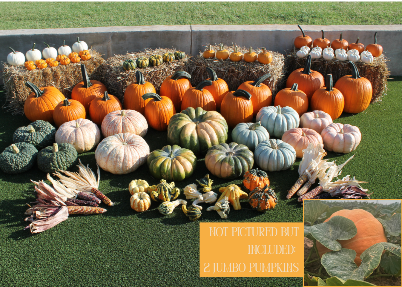 Plus- an assortment of mini orange and white pumpkins, gourds, and Indian corn.